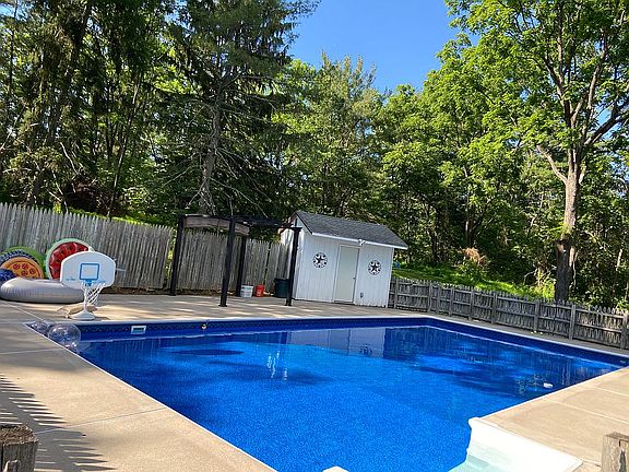 It is in a peaceful area surrounded by nature, but close enough to anything one might need. It is a charming old farm house from 1875 with an addition put on in 1975. It still has the original floors in the original portion of the house. Along with the original stained glass windows and tiles around the fireplaces. The original farm house has 18" thick stone walls. Brand new roofs and siding on the main house as of Sept. 2023. The 5 car garage has a 2 bedroom 1 bath in-law-suite with a deck. There is also a small cottage on the other side of the garage that is a rental. It is a 2 bedroom, 2 bath residence with a deck. There is also a 1 car garage and a pool with a pool house.