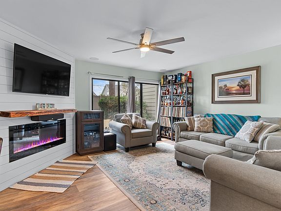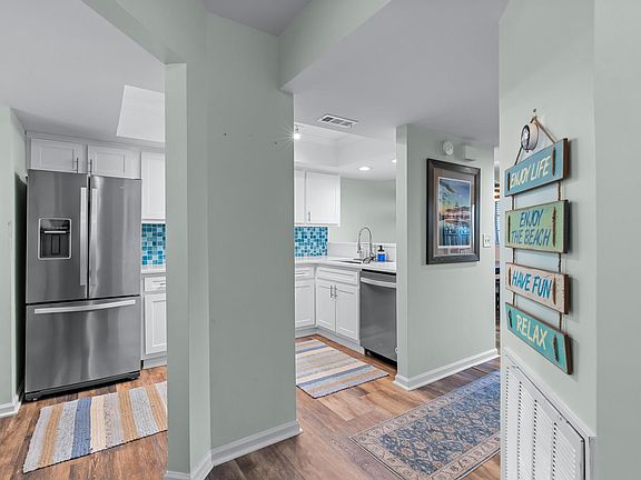 Step into this beautifully updated 3 bedroom, 2.5 bath townhome in the highly desirable Shadow Moss community of North Myrtle Beach. This inviting townhome features a bright and airy layout with coastal-inspired finishes and modern upgrades throughout. The kitchen is a equipped with stainless steel appliances, crisp white cabinetry, and a vibrant blue tile backsplash. The main living area is warm and welcoming, complete with a shiplap-accented electric fireplace, ideal for relaxing evenings. Upstairs, the spacious primary suite features vaulted ceilings and a contemporary ceiling fan, creating a peaceful retreat. With updated lighting, durable LVP flooring, and a private outdoor patio, this home is perfect for full-time living or a vacation getaway. Located just minutes from the beach, golf, shopping, and dining—this is beach living at its best! All information is deemed reliable but not guaranteed. Buyer responsible for verification.