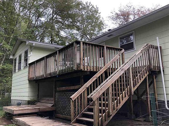 Great family home in super in-town Woodstock location. Located on dead-end cul-de-sac off of Simmons Drive. Walk to town, Andy Lee Field, Community Center, and bus to Kingston. Mother-daughter set-up with kitchenette, full bath, bedroom, dining area and family room with fireplace on lower level. Top floor has 3 bdrms, full bath, open liv rm/dining rm/kitchen layout, and large sunny den that could be office or additional bedroom (has armoire and cabinets). Great low-maintenance Trex deck, with wooden built-in lounge area below and patio underneath. 2 car garage. Large fenced-in backyard, bordered by woods in rear. New floors on lower level. Just freshly painted white!