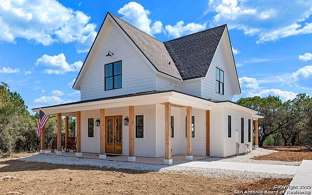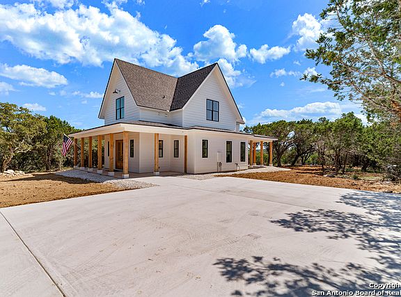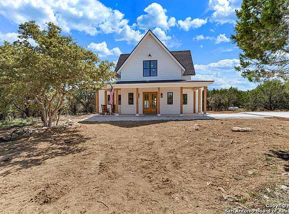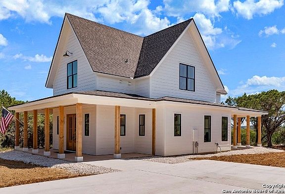 Outstanding modern farmhouse completed in 2020 and set atop 4 beautiful acres in the Texas Hill Country! 3 BDRM, 3.5 BATH, Craftsman style home immediately welcomes guests into an open floor plan through handsome double doors. Just past, the beautiful staircase creates a striking first impression! A chef's kitchen sets the stage for outstanding culinary adventures with a large island, breakfast bar, gas stove/electric oven, farm sink, soft close cabinets and quartz counters. Generous accommodations include a main-level master suite plus 2 comfortably sized BDRM each w/full bath upstairs. Completing the second level is a flex space with a closet that may function as a FOURTH BDRM, PRIVATE STUDY, OR MEDIA ROOM. A high-end Mitsubishi 6-unit split AC/Heat Pump keeps the home comfortable year round. Outside, soak in bluff views while enjoying your morning coffee on the wrap-around back porch or beside your cozy fire pit, both overlooking approximately four acres of privacy and trees. The winding concrete driveway offers an abundance of level parking, and the acreage also features a lovely meadow and seasonal creek at the rear of the property. Plentiful wildlife are easily spotted, such as white-tailed and axis deer, turkey, and lots of birds. Bow hunting and horses are allowed! Swim, kayak, or tube on the Guadalupe via two private access HOA Guadalupe River parks. Enjoy fishing, a neighborhood pavilion, and kids play area at the Spring Creek Park. All just 20 minutes to downtown Boerne and 45 mins to The Rim/La Cantera for shopping. With access to award-winning Boerne Schools and a low tax rate, don't wait too long to see this one! Furniture can be purchased, ask your realtor!