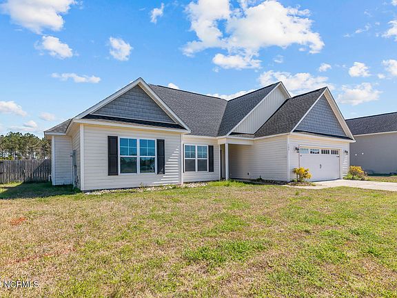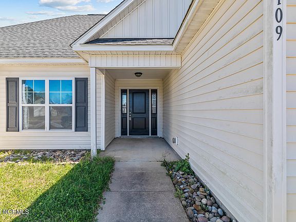 Welcome to 109 Stony Brook Way! This charming 3 bedroom, 2 bathroom home is nestled on 1.1 acres of lands. Upon entering, you'll be struck by the open feel of the living room. The kitchen boats gorgeous wood cabinetry, stainless steel appliance, and plenty of counter space and the seamless transition between the living room, dining space, and kitchen makes this home perfect for entertaining friends and family. The Master suite includes two walk in closets, double vanity sinks and a large garden tub with a separate shower. Each bedroom is carpeted and boasts double-door closets, and the second bathroom features double vanity sinks. Outside, you will find a large fenced-in backyard that is perfect for your furry friends or little ones. The best part is that it's right outside of city limits and just minutes from Camp Lejeune, shopping, and restaurants.