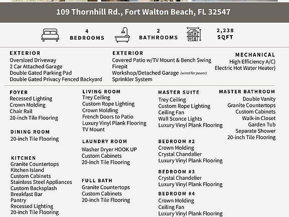 Seller paying $10,000 toward buyers closing costs! Custom 4-bedroom, 2-bath all-brick home is the perfect place to call home in Fort Walton Beach! Open floor plan is ideal for entertaining, w/living room featuring trey ceilings & custom lighting. Kitchen offers granite countertops, stainless steel appliances, breakfast bar & pantry--all flowing seamlessly for gatherings. Master suite boasts a trey ceiling, dual vanities, soaking tub, walk-in shower & expansive walk-in closet. Outside, enjoy a covered patio w/bench swing, firepit & privacy-fenced backyard perfect for relaxing evenings or weekend cookouts. Oversized driveway & gated parking pad provide space for RV, boat or extra vehicles. Close to shopping, dining, schools & the sugar-white sand beaches of the Emerald Coast.