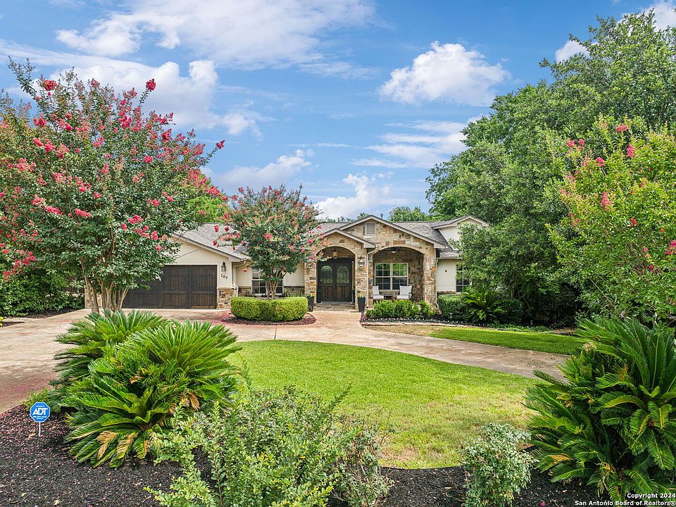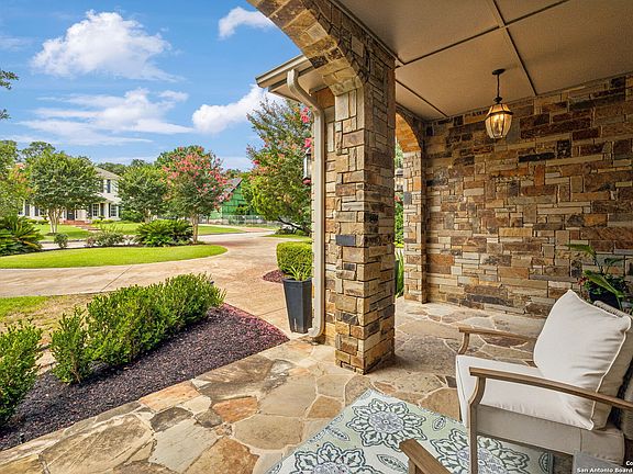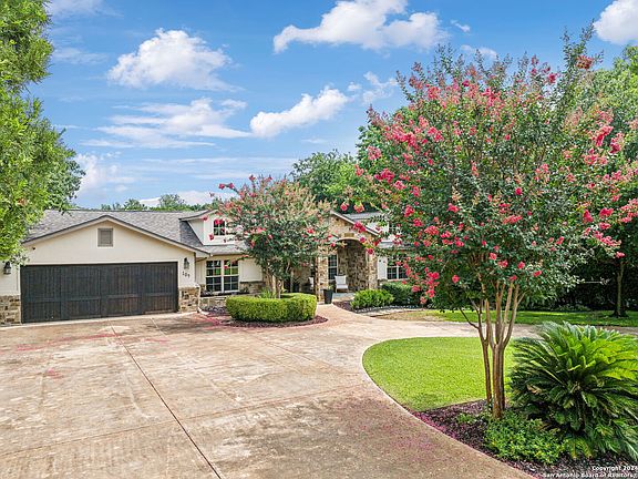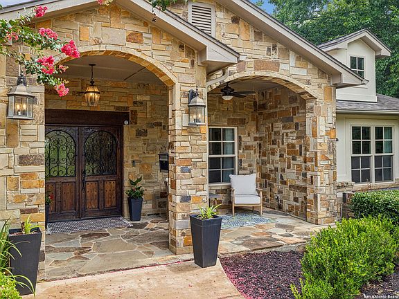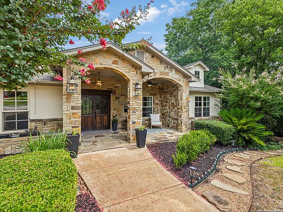 This Hill Country style one-story home on a quiet street welcomes you with its dramatic entry and spacious open design. One of the many highlights is the grand gourmet kitchen that is truly the hub of the home. Featuring gas cooking, Subzero refrigerator, copper sinks, slate floors and a huge island, it's a room that everyone will love. Adjoining this hub is the inviting family room with stone fireplace and attractive built-ins, and both spaces are lined with walls of windows enjoying views of the lush and private backyard oasis which includes a large covered patio, sparkling pool and plenty of additional space for outdoor fun. The private primary suite offers a luxury bath with large closet, separate vanities, a soaking tub and a walk-in shower. Three more bedrooms are on the other side of the house and all bedrooms have hardwood floors. A circular driveway and two-car garage with extended driveway allow parking for several vehicles.