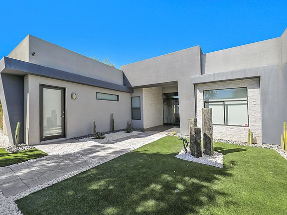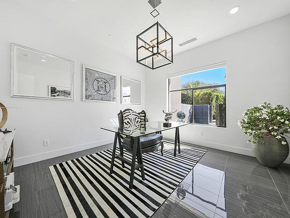 Unique / rarely on the market opportunity, this exquisite modern home spans over 4,100 square feet of precise design and details. Including 4 ensuite bedrooms, 5 baths, office and a theater room. Vaulted ceilings expanding 10 - 14 feet high, lots of natural lighting, combine outdoor entertainment with interior by opening the Fleetwood pocket doors and keep cool air in with the patio air curtains. Chef's kitchen includes quartz countertops, custom cabinets, Bosch dishwasher and Wolf appliances. Great room includes wet bar with a unique saltwater fish tank behind it, and fireplace in the living room. Interior upgrades include designer LED lighting accents, electric shades, Lutron Smart Home, Low E Gas rating, tankless water heaters, water softener, and much more. Primary bedroom is adjacent to the theater room. Primary bathroom includes soaking tub, separate shower, and western mountain views. Outdoor entertainment areas provide misters, heaters, upgraded bar / kitchen with television and plumbed in gas BBQ grill, wood-like tile flooring, granite counter tops, and upgraded appliances. Dine or relax outdoors by a separate fire pit area with seating and a mounted television. Backyard updated deck with interlocking pavers around the spacious salt water pool with spa and tanning deck, desert landscaped. 3 car climate controlled garage with new cabinetry, AC unit, and epoxy flooring, sold furnished per inventory.