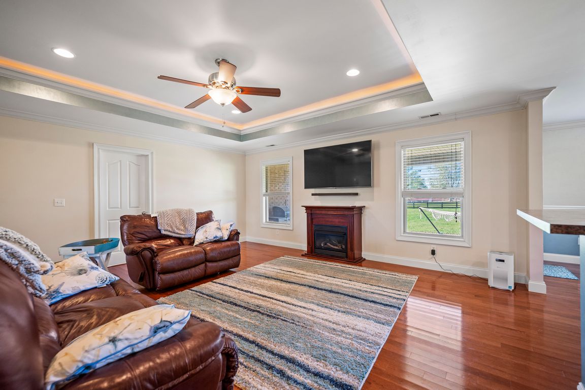 Gas logs fireplacePantry closetGleaming hardwood floorsStainless appliancesSplit bedroom designDouble closetsDouble bowl vanity