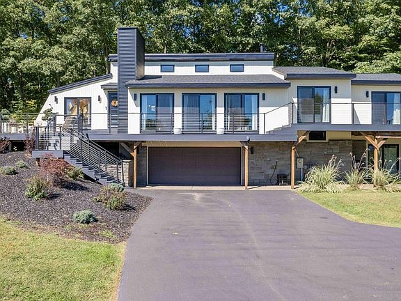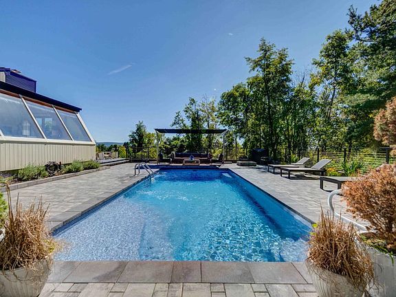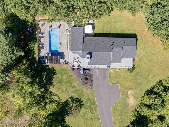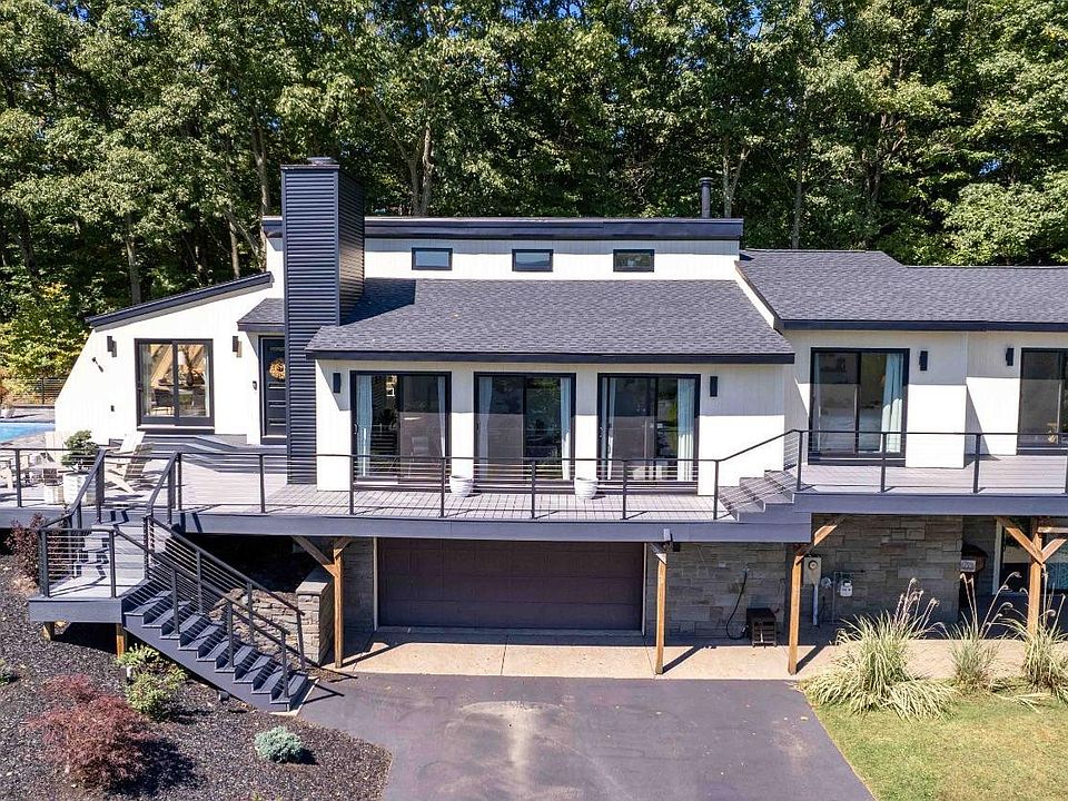 Discover modern luxury in this stunning contemporary home, perfectly situated on 4+ private acres with mountain views, located on a dead-end road. Expansive decking surrounds the home & numerous sliding doors create a seamless flow between indoor & outdoor living making this home ideal for both relaxation & entertainment. The open floor plan also provides a seamless flow from room to room. The kitchen offers top of the line appliances & a large island. Step into the sunlit dining area & bar located in the sunroom, which overlooks the heated saltwater pool. A spacious living room with mountain views offers a wood burning fireplace. The finished walkout basement features a gym, full bath & laundry area.Newer roof & HVAC
