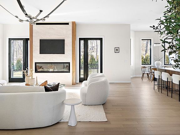 Stunning new construction is the perfect blend of modern luxury and natural elements. Meticulously designed to showcase the airy layout, abundance of natural light through oversized windows and custom finishes of the highest quality. Nestled in one of Newton's most coveted areas, this masterpiece boasts 6,600+ SF of living space spread across 4 living levels. First floor has soaring ceilings featuring a 19 ft foyer, living room with gas fireplace which opens into a gourmet chef's kitchen with top-grade Thermador appliances, two-tier island, breakfast nook and walk-in pantry. The spacious dining room has a formal sitting area, perfect for gatherings and entertaining. Second floor is completed by a primary bedroom with two custom walk-in closets and spa-grade bath, 3 additional en-suite bedrooms and laundry. Lower/4th levels offer additional bedrooms, gym, wet bar w/ wine display. A covered patio effortlessly transitions inside/outside living with a fully private yard and walking trails.