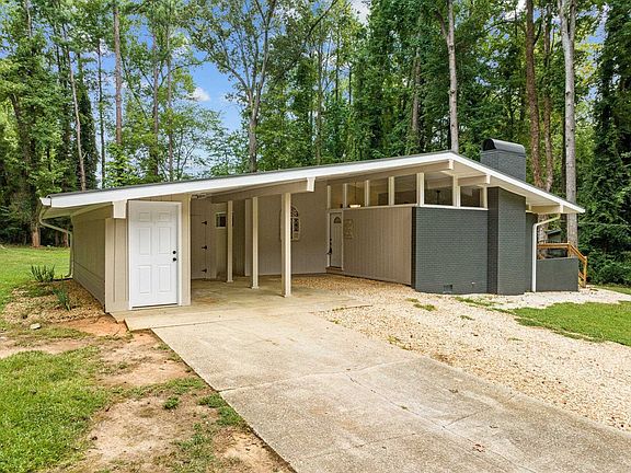 Welcome to this modern mid-century 1 story home in "Old Cary"! Situated on a large, flat lot, surrounded by trees, this property offers both space & privacy. With exterior & interior paint done just 3 years ago, this home showcases a fresh & modern look that complements its mid-century, vintage charm. As you step inside, you'll be captivated by the open floorplan & cathedral ceilings, while the large windows flood the space with natural light. The family room is the heart of the home & features a floor-to-ceiling painted masonry wood-burning fireplace. The kitchen seamlessly flows to each dining area & out to the spacious deck, making this home perfect for entertaining. The long driveway & attached carport provide parking for any number of guests! Have peace of mind with an Orkin termite bond, 3 year old roof, vapor barrier and sump pump! The 2 storage rooms & 12 x 20 shed allow plenty of storage keeping things organized & clutter-free. In this ideal location, you'll enjoy easy access to nearby amenities, schools & parks, making this the perfect place to call home.