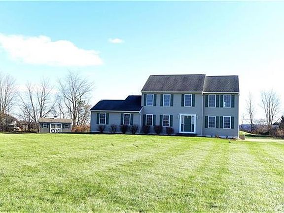 Charming, modern colonial, set on a flat, corner lot with lovely, Panoramic Mountain Views!!! Enter to an open center foyer w gleaming hardwoods which flow into the adjacent Formal Dining Room. Following is a large, eat-in Cherry Kitchen w tile floors, slider to deck and which is open to the vaulted-ceiling Family Room w propane fireplace which extends into a Formal Living Room. A convenient mudroom off the 2-car garage, laundry and half bathroom complete the 1st level. Upstairs, find a spacious Master w Walk-In Closet and full bath w jetted tub, shower and double-sink vanity. 3 more spacious Bedrooms w ample closets and another Full Bath round out the 2nd floor. The large basement w high ceilings is ready to finish or use for storage. Outside enjoy the deck or patio in the private back yard w storage shed and electric hookup for a future above-ground pool! Removed, country feel living, but just minutes to Routes 209 or 33 for commuting. See it today before it's gone!