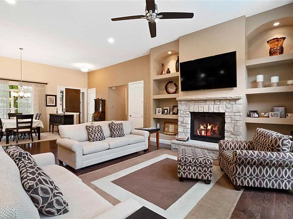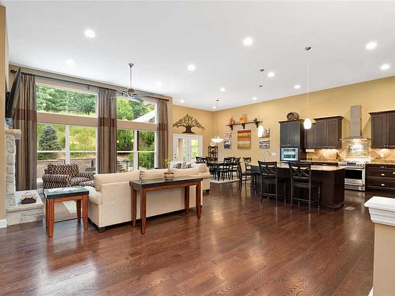 This jewel with a pool is packed with pizzazz! 3BR/2.5ba ranch offers taste plus space throughout 2350sf! Dramatic open floor boasts 12 ft ceilings, wood floor, gourmet kitchen, great room, dining room & main floor laundry. Dream up delicacies with top-quality SS appliances, granite counters, tile backsplash, staggered cabinets, soft-close features, pull out shelves & walk-in pantry. Great room is worthy of its name with wall of transom windows, built-in shelves & stone f/p with raised hearth. Vacation in your own, private, resort-like backyard with sparkling, gunite, saltwater pool that offers expansive patio surround, raised covered deck & separate firepit area. MBR suite even has private French door access to pool, perfect for that late night dip! Other home highlights include: 10 foot entry door, recessed lighting galore, 5 inch base trim, silent floor system, 400 amp service and 2 foot rear extension in garage. 3/4 rough-in LL, inground sprinklers and Christmas light package.