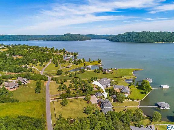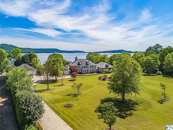 Main channel Guntersville waterfront home on gated 2.8 flat/level acres. 210 ft. of stone seawall, custom Trex/Hardie 2 slip boathouse, beautiful sunsets. 5 bdrm, office, bonus. 2-car attached and 3-car detached heated garage. Large great room/dining open to stunning lawn/lake. Kitchen with granite and Viking appliances. Main level master with double sided fireplace, coffered ceilings. Fabulous master bath, travertine,, double sink vanity, large closet. 2 add'l main floor bdrms with Jack & Jill bath, gorgeous 2nd full kitchen with keeping room. 2 main level laundry rooms. Second master bdrm/bath and 5th ensuite bdrm upstairs. Outdoor stone grill gazebo, pergola, fountains, fenced, generator.