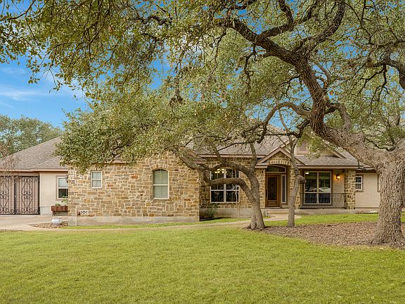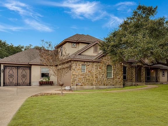 Desirable River Crossing custom community offering beautiful, private Guadalupe riverfront park and peaceful Hill Country living on one acre lot with pool! Community offers low HOA, acclaimed Comal ISD schools and low property taxes. Play golf? Course membership is very reasonable and optional! Large open entry with niche and dining room w/ wood floors invite you into this lovely custom home! Private oversized study overlooks front lawn and is easy access to master suite. Large open living room is rich with stone accents and fireplace looking out toward patio and pool. Enjoy cooking in the perfectly laid out kitchen boasting custom cabinetry with island and breakfast bar and large walk in pantry. Gas cooking and double oven available for cooking for a party! Split plan master retreat features access to exterior deck and pool. The spacious master bath includes walk-in shower, garden tub, separate vanities and large walk-in closet with built-ins! Enjoy staycationing in your own backyard, lounging on the deck or flagstone pool deck, enjoying the cook nights at the fire pit or swimming laps and enjoying a dip in the hot tub. Secondary bedrooms share a Jack and Jill bath, offering each room a private vanity. Second half story level abodes game room with a private bedroom and full bath. Extra third bay garage storage for a boat or RV and Separate 2 car garage!
