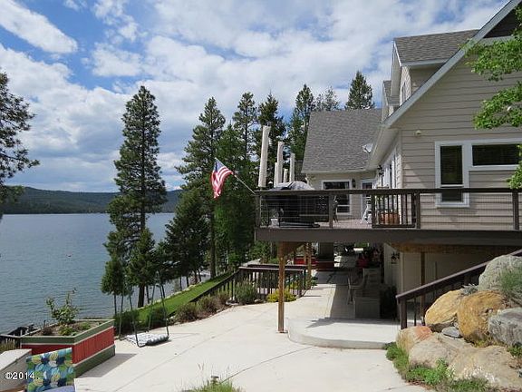 Beautiful big home w/152 ft. of frontage on Bitterroot Lake with a high lot and a gentle pebble peach with an excellent dock, all on a 1.24 acre lot. The home is a year round design for comfort and pleasure. With 5 bedrooms and 6 bathrooms, big formal dining room, huge kitchen/LR, den, sewing room, family room, play room, multiple levels, decks and patios. The master suite is on the main floor and the upstairs has a huge flexible play room, as well as two nice bedrooms. The big finished basement has a very nice family room, is walkout to an under-deck looking at the water and the water slide. There is a big door shop on the lake side of the basement with a woodworking shop in it for hobbyists. There is a 171 acre common area across the road and up the mountain, for walking or ATVs. NICE!!
