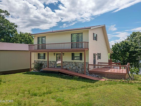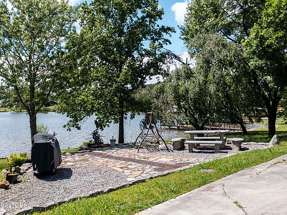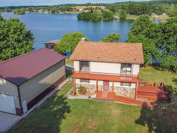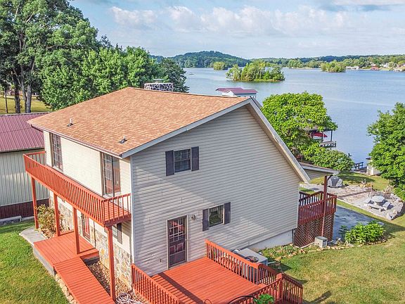 LAKE & RV LOVERS--RARE COMBO AHEAD!! Lake living with new 2022 insulated RV garage/storage building!! Call this inviting 3/2 lake cottage your full time home, weekender or even income-producing rental. Absolutely stunning views that bring the outside in. Enjoy some elbow room with .72 acres in a park-like setting. Spacious & airy great room with cathedral ceilings. Gorgeous stone fireplace. Generous-sized bedroom and bath on the main level--upstairs are 2 more bedrooms with balcony, another full bath and a large space that could make a great office. Sizable bonus room and a spacious garage on lower level. Outside is a one-of-a-kind wonderful picnic area to catch the sunsets over the lake. Large 2-slip boat dock and your own private boat ramp, ready and waiting for your water toys. 32 x 48 detached insulated building built for RVs and/or storage easily houses vehicles up to 45. Add'l updates include new concrete driveway and pads, roof, paint, flooring, updated bath, chimney, water heater, decks and electric upgrades. No HOA & light restrictions in quiet lake community close to shopping and medical. DSL and internet options avail.