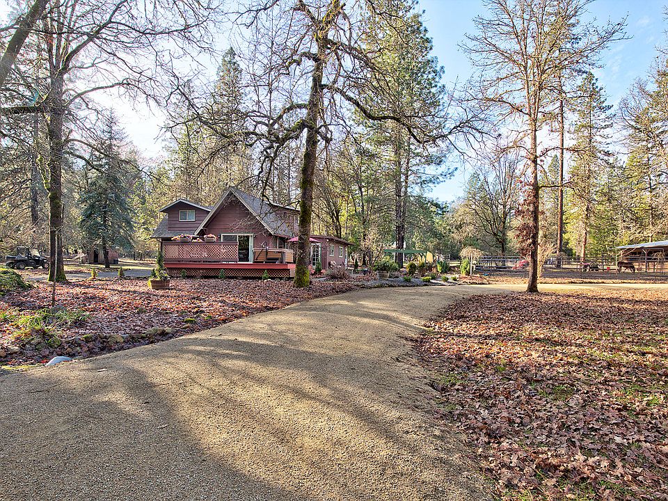 Beautiful Fairy Tale Cottage in Southern Oregon. Updated 3 bed 2 bath chalet with charm throughout on 5.21 level private acres set up for the equine enthusiast. Kitchen and bathrooms have been recently remodeled with granite countertops, updated fixtures, plush carpet, tiled bathrooms and a clawfoot tub for a luxurious soak. Updated vinyl windows that let the outside in, exposed wood beamed cathedral ceiling in living room, large multi level deck, Master suite on lower level. Large barn with 4 + horse stalls, hay storage, tack room w/ concrete floor, room to park lots of toys, and covered runs off the back. 60'x96' pipe panel paddock with all-weather footing and an approximately 148' x 166' arena set up for roping complete with chute and box. Perimeter and cross fenced with automatic gate, detached 2 car garage/shop, Koi pond, circular drive, low maintenance landscaping, chicken coup, and so much more. High Speed Spectrum internet available.