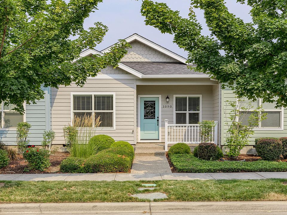 Great opportunity for a super cute, well maintained rowhome in the award winning Twin Creeks Development. Perfect first time homebuyer or retiree property, easy care and efficient! Nice curb appeal with brand new exterior paint. Open floor plan with vaulted living room/dining area and adjacent kitchen. Custom kitchen cabinets, under cabinet lighting, gas range, pantry cabinet and granite counters. Utility room with cabinetry and folding counter. Vaulted Guest Bedroom. Adjacent full guest bath with granite counter on a large vanity. Spacious master bedroom with alcove for home office/nursery/sitting area. Master bath with large shower, granite counter, linen cabinet and custom mirror. Finished oversized 1-car garage, 16' wide with 10' wide door. White vinyl fenced area in rear yard. Beautiful pocket park directly behind, 1 block to 7 acre Civic Area and 1 block to new Don and Flo Bohnert Farm Park. Landscaping maintained by association.