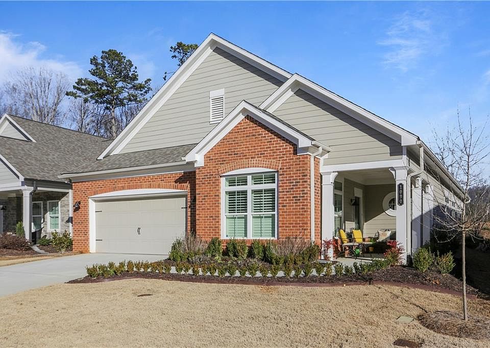 Nearly new home in perfectly situated active adult community with a view of Kennesaw Mountain. You won't believe how much space this "small home" has. Enter through the adorable, covered, rocking chair front porch. Roomy entrance foyer with high ceilings opens to sunny den/office/3rd bedroom and to the guest bedroom with connected full bath/ powder room. Wide, accessible thoroughfare leads to open concept kitchen/ living/ dining area. White kitchen with huge island/ breakfast bar, quartz countertops, & gas cooktop provides plenty of room for cooking and entertaining. Dining room of off the kitchen is large enough to accomodate a 12 person table. Kitchen opens to large living room with a gas log fireplace and a bright all seasons room finishes out the living space. Outdoor courtyard/ patio can be accessed from all seasons room and from primary bedroom and provides an excellent view of Kennesaw Mountain. Oversized primary suite includes a sitting room, and his & hers walk in closets. Primary bath has a double vanity and a large, zero entry, handicap accessible shower. Primary bath connects to laundry room which also connects to mudroom/ garage entrance. 2.5 car garage with extra room for a workbench or storage. This home has tons of upgrades and still feels like new. With all of the extra living spaces, high ceilings, and ample storage, your downsize will feel like an upsize! This community of only 36 homes is the perfect size to get to know your neighbors. And, the location is ideal, with easy access to the shops/ restaurants on both Barrett Parkway & Dallas Highway and close proximity to the trails of Kennesaw Mountain Battlefield National Park and the Historic Marietta Square!