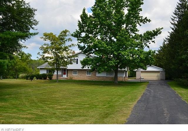 Wonderful larger split level that is set on a picturesque 13.56 acre double lot with pond and woods. This open floor plan offers a spacious light filled living room upon entering from the front door. Picture windows from the living room and dining room from the south and north allow an abundance of natural lighting. The eat in country kitchen is open to the family room. It has solid wood cabinets and all appliances will remain. The lower level family room has a brick accent wall with large wood burner, berber carpeting and sliding doors to a three season porch which is great for entertaining or to enjoy the views of the pond and those wonderful sunsets. There is also a full bath on the first floor and a large office, mud room or extra room to make your own. Second floor has three bedrooms with double closets and all have hard wood floors. There is also a large full bath. The home offers newer furnace, central air, electrical panel box, basement waterproofing & more. There is an attached two car garage and a detached oversized two car garage. Enjoy the great location in Aurora that is close to shopping, schools and highways.