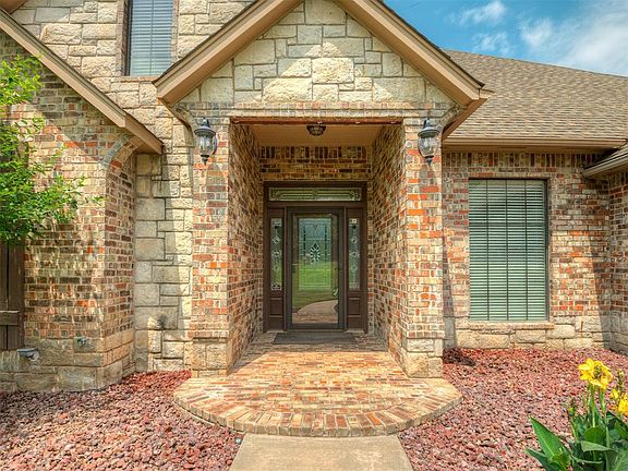 Experience the peaceful, partially wooded 4.07 acre lot in Hunters Ridge addition in North Edmond, This beautiful Cul-de-sac property with curb appeal and no neighbors behind has a true entryway with high ceilings and features a kitchen with granite island/bar with stainless steel appliances, walk-in pantry and lots of storage, have cofffee in the breakfast area overlooking the lush green backyard. Relax in front of the stunning fireplace in the spacious living room, formal dining room with gorgeous wood floors and a large covered patio and backyard perfect for outdoor gatherings. With 3 bedrooms downstairs, The master suite includes a luxurious en-suite bathroom with separate vanities, a soaking tub and separate shower with a large master closet. Split floorplan offers 2 additional bedrooms with a jack and jill bath. The downstairs office has a wall of builtins and a closet for your work from home needs. Upstairs bonus room with a half bath could be 4th bedroom or gameroom. Oversized Laundry room has extra storage. Long driveway provides extra parking, a 2 car bay with epoxy floors, storm shelter and is wired for a generator and an additional single bay perfect for workshop or storage. As one of the largest lots in the neighborhood, the beautiful lot has room for horses, pool or shop, this home offers comfort, style, and privacy. Located 10 min from I-35 and a short drive to shops and restaurants that Edmond has to offer and in highly rated Edmond Schools.
