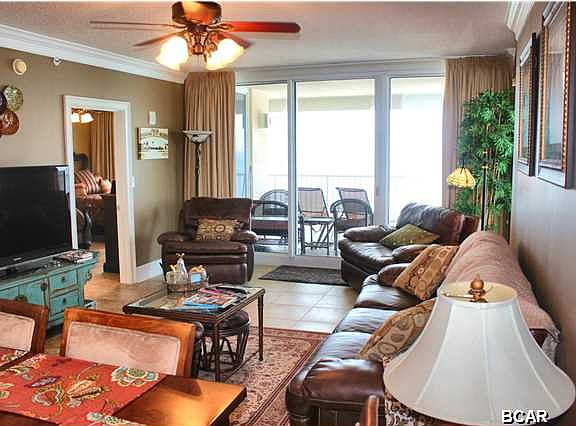 BEST FLOORPLAN AND BEST APPOINTED CONDO IN MAJESTIC BEACH! HANDS DOWN THE NICEST UNIT IN THE DEVELOPMENT. TERRIFIC LOCATION WITHIN THE STACK. TWO PRIVATE BALCONIES. OWNERS HAVE SPARED NO EXPENSE - COMPLETELY UPGRADED ABOVE AND BEYOND TO SUIT THE OWNER’S DISCERNING TASTE. This enormous, 1,610sqft west corner unit is the thing of which dreams are made, conjuring up images of sun-splashed days of swimming, biking and relaxing. It lives like a beach house but comes with all the benefits of owning a condo. This property has been meticulously maintained as a second residence (New HVAC in 2014). Tiled throughout and conveys with luxurious furnishings, window treatments, and artwork that welcome you to lie back, relax, and enjoy panoramic views of the pool, beach and ocean. Condo has 9’ ceilings and crown molding throughout. Open floorplan allows for fabulous Gulf and sunset views from balcony, living room, dining room, kitchen, & master suite providing the ultimate alfresco living and entertaining environment!. The fully equipped kitchen features upgrades such as custom cabinets, solid granite kitchen countertops, stainless steel appliances, upgraded sink, custom tile, and tumbled marble backsplash & breakfast bar. Sunset views from the tiled, private, 390sq ft, wrap-around balcony are a perfect end to a sunny day and beginning to an exciting evening. This massive condo has 4 bedrooms & 3 full bathrooms. MAIN MASTER SUITE is front and center on the beach with direct access to the main balcony and private bath complete with garden tub, tumbled marble tile work, separate shower, and large walk-in closet. The master suite opens from a glass slider door to a covered balcony. In additional to the sliding glass door, a floor to ceiling window frames amazing views – in essence, a wall of glass! SECOND MASTER SUITE also has it’s own private bath. THIRD GUEST BEDROOM is large and has it’s own private balcony. This bedroom has easy access to a 'Jack and Jill' bath that is shared with the FOURTH BEDROOM which is currently set up as a parlor. All three bathrooms feature polished marble flooring and custom vanity sets. Condo has a front loading washer and dryer. LUXURY! COMFORT! CONVENIENCE! Can be configured to sleep up to 12 people! EXCELLENT RENTAL INCOME POTENTIAL. Enjoy the good life at Majestic Beach with an unparalleled deck of resort style amenities including: 650 linear feet of sugar white GULF FRONTAGE, Four Large outdoor pools (2 at Tower I and 2 at Tower II), Two Indoor heated pools (one in Tower I and one in Tower II), Two hot tubs, Baby pool, Wading pool with waterfall, H20 Bar and Grill serving Gulfside/Poolside lunch and dinner, Large outdoor dining area, State of the Art Fitness center with steam room and sauna, 130 seat Stadium seating Movie Theatre, Convention center, Private Owner's Lounge with full Kitchen, Tennis Courts, Majestic Market featuring Starbucks coffee. Quick distance to the the wonderful shopping, dining and entertainment at Pier Park. FROM THIS CONDO, YOU ARE WITHIN STEPS OF EVERYTHING YOU COULD EVER WANT AT THE BEACH!