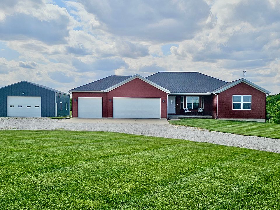 Only 20 minutes SSW from Bloomington! Check out the views from this amazing 4 bedroom/3 bath ranch on 10 acres adjacent to Clinton Lake conservation land with trail access to the north fork of Clinton Lake. Access to trails for hunting, fishing, canoeing, hiking, mountain biking, etc. This custom home also comes with a 32x40 insulated/heated building & 3 car garage. Only 8 years old but shows brand new. Kitchen is open to the dining & family room with views out back. New interior paint 2024. Some of the recent updates include concrete floor with drains in building ('21), spray foam insulation, ('21), finished basement with large family room, 4th bedroom, remodeled full bath & office/possible 5th bedroom ('23). Whole house stereo/deck. Full list of upgrades available. Dewitt County property taxes!