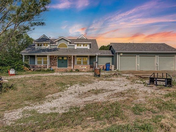 Welcome to Country Living! Enjoy this lodge feeling home on almost 4 acres of land. Master Bedroom Suite is on the main level with 3 generous sized bedrooms on the upper level. Lots of walk in closets! 5th bedroom on main level is ideal for a front office! Kitchen features tile floors and all appliances to stay - including washer and dryer! Dining room features tile floors for easy living as you access the back of the property. Basement has room for storage and is storm rated for protection. Garage is wired with a 50 amp 240 plug. Exterior doors have been updated to Pella triple lock. Outdoor features an outside building with power. Green House located on the property houses the irrigation well that is connected to the sprinkler system. Seller is selling property as is.