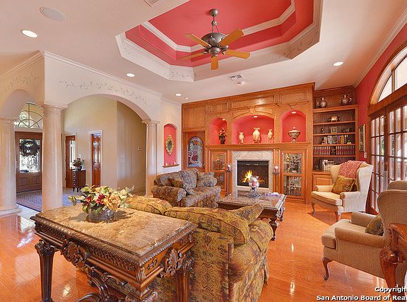 Stunning & beautiful 3/3.5 single story Mediterranean style estate in Hunter's Ridge; Luxurious resort style outdoor living w/manicured lawns & landscaping; Extended covered tiled patio is wired for entertainment overlooking sparkling pool & adj. spa surrounded by palm trees & majestic oaks; Interior is very well appointed w/architectural details throughout including layered tray ceilings, arched windows, crown molding, custom 4" plantation shutters; Gourmet kitchen, media room & Master w/sitting room.