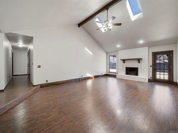 Updated single story home on a spacious cul-de-sac lot! Four bedroom home boasts fresh interior/exterior paint. Engineered wood flooring throughout; even the bedrooms! Vaulted beamed ceilings with abundant natural light and wood burning fireplace. Master bedroom with full ensuite bathroom. Spacious hall bathroom. Covered back porch and fully fenced yard. Ideal location right off the Memorial retail corridor; Bixby North schools!