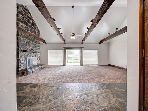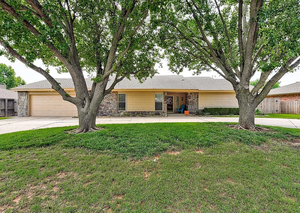 Stunning, well-maintained home with a circle driveway! Unparalleled style and charm, this one-owner property is sure to impress. As you step inside, you'll be greeted by the breathtaking living room with its vaulted ceilings, exposed beams, and floor-to-ceiling stone fireplace. Huge picture windows and patio door provide a picture-perfect view of the back yard. The south end of the home features two spacious bedrooms, a guest bathroom, and a utility room with ample storage. The owner's suite, located on the north end, offers a walk-in closet and a luxurious ensuite with double sinks and a beautifully appointed walk-in shower. The kitchen and dining area complete the floorplan with a large island, a wall of pantry storage, and access to an oversized patio. Enjoy plenty of storage space for lawn equipment with the outbuilding in the backyard and oversized garage. Conveniently located just minutes away from Lake Hefner Parkway, Kilpatrick Turnpike, and NW Expressway, this home is perfect for those seeking a prime location and comfortable living.
