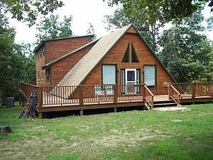 Rustic charm in this newer one of a kind A-Frame, 4 BR, 2BA home on 3.31 acres. Knotty pine, cathedral ceiling in great room & kitchen. Spacious master suite, huge deck & wooded lot.