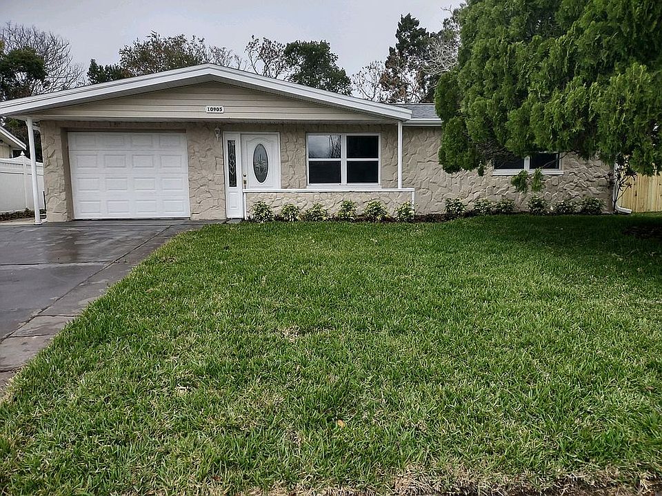 Your new home is located in the quiet neighborhood of Holiday Hills, close to schools, shopping centers and restaurants. Witness beautiful sunsets over the Gulf of Mexico at Hudson Beach, less than 5 miles away. With an open concept that blends the living room, kitchen, dining area and sunroom, this meticulously renovated home offers two bedrooms able to accommodate a king size bed with the potential of a third bedroom. The custom designed kitchen offers new cabinets, with center island, and a complete package of new appliances: stove, microwave, refrigerator and dishwasher. The bathroom is beautifully done with a Carrara Marble vanity, coordinating tile floor and wall tiles, porcelain enamel tub and brushed nickel trim. Tilt out windows adorn marble sills throughout each room. This home has been freshly painted inside and out, including the one car garage. New Roof in 2021. The 2024 upgrades include: New floors installed throughout the home with vapor barrier protection to block moisture, updated laundry area, new 40-gallon Rheem Professional Hot Water Heater, New Central Air Conditioning, New Electrical Panel including switches/plugs, old copper plumbing has been removed and replaced with Lifetime Warrantied Uponor Pex. Enjoy the outdoors sitting on your covered lanai with ceiling fan, privacy with a fenced in yard that provides plenty of room for a pool/hot tub, or simply enjoy the deck area which includes electricity. The lawn was professionally landscaped by Landscapeology LLC. An additional 10’x14’ windowed building in the backyard has electricity and would make a great craft room, sewing room, workshop or man-cave. If you’d like to own the best house on the block, this move-in ready, worry-free home could be yours. Please contact Ray at 727-247-9349 for an appointment. No Realtors.