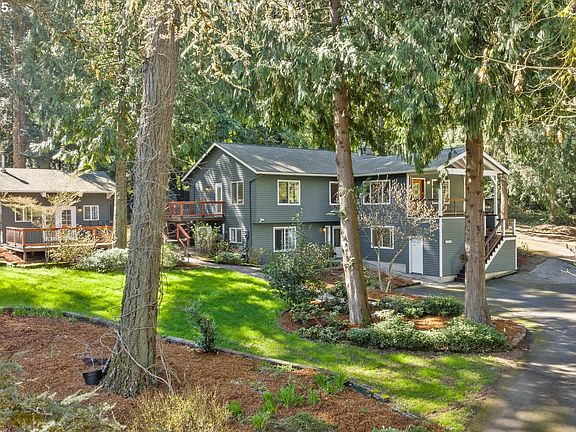 This beautiful home is nestled directly across the street from the serene walking trails of Tryon Creek State Park. Situated on a spacious half-acre lot, it offers a perfect blend of comfort, functionality, and thoughtful updates, all enhanced by a well-designed open floor plan. The main level features an expansive kitchen--a chef’s dream-- ideal for entertaining, with large windows that fill the space with natural light. It also includes a gas stove fireplace, and a primary suite with an ensuite bath. The lower level boasts a spacious living area/bonus room with versatile uses, a wood-burning soapstone stove, and an additional room perfect for a wine cellar or exercise space. Ample storage throughout the home ensures everything has its place. The oversized 1,211 sq. ft. workshop/garage features two loft spaces and a separate workspace, providing ample room for projects, recreational needs, and outdoor gear. Situated on over a half-acre lot, surrounded by nature, the lush, mature landscaping provides a tranquil retreat for gardening enthusiasts. The expansive backyard, complete with a stone fireplace, is perfect for entertaining or simply unwinding in a peaceful setting. Additionally, the separate 322 sq. ft. ADU, featuring a soapstone wood stove and loft, offers endless possibilities--guest quarters, a home office, rental income, or a private retreat. HVAC system is new as of 2023.