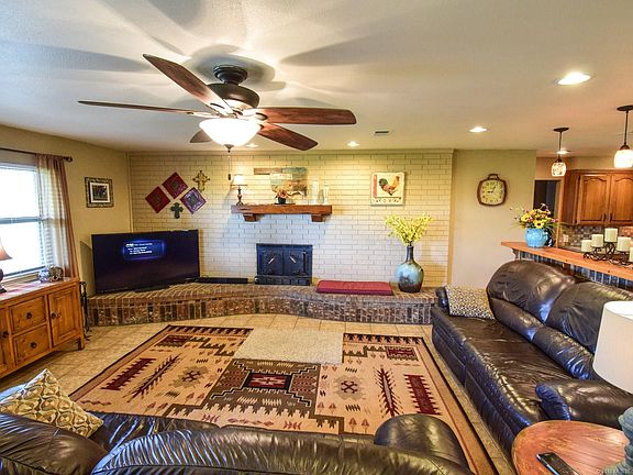 Ranch home on 63 acres with beautiful mature trees and open pastures.Home is a 4/2 and was remodeled in 2010.Priefer fence around the home.Two ponds and fenced.Shop/garage is appx 50'x25' w/concert floors,1 bath,a Hausner storm shelter.Barn appx 50'x40'