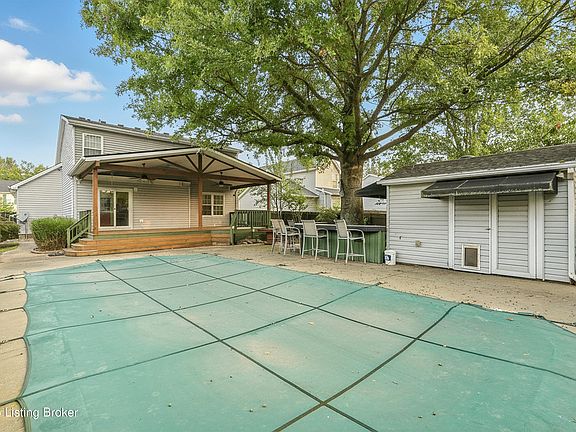 Welcome to 10906 Pineview Court, located in the desirable Springview neighborhood just minutes from J'town. This home offers three bedrooms, two full baths, and a spacious two-car garage. As you enter through the front door, you are greeted by a spacious vaulted great room, highlighted by beautiful hardwood floors and a cozy fireplace. The primary bedroom is conveniently located on the first floor, just off the great room, and offers direct access to the full bath. The eat-in kitchen offers newer cabinets, granite countertops, tile backsplash, and under-cabinet lighting. Step outside to the covered deck overlooking the beautiful in-ground pool, complete with a pool house shed and a wired outdoor bar. The backyard feels like a private retreat, perfect for relaxing or entertaining guests! Upstairs, you'll find two additional bedrooms, a full bath with an updated vanity and granite countertop, and a large walk-in closet that leads to an unfinished attic area above the garage. Notable updates include replacement windows (2019), new AC unit (2023), and new water heater (2024). This home also has a central vacuum system. Don't miss this rare opportunity. Schedule your private showing today!