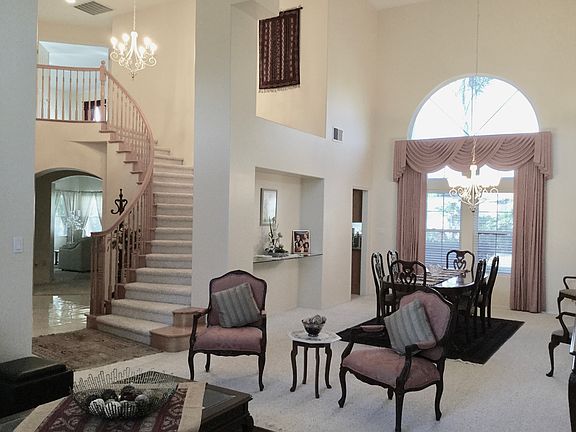 A Spacious & Extraordinary Home. Beautiful 2-story, 4 BR/3 BA home in the desirable Seven Oaks neighborhood. This exceptional property is 3,496 sq ft of living space. The broad and shaded portico greets you with double front doors that open up to a beautiful staircase. The master suite dons a jacuzzi and fireplace, while the three other bedrooms offer custom built-in closets. In addition house features an office, living and dining rooms with high vaulted ceiling, and a spacious family room with fireplace. The upgraded kitchen offers granite countertops and a center island. The home has a 3-car garage. Added perks include refrigerator, custom drapes and blinds, and thermal-laminated windows for cooler interior. The outdoor covered patio overlooks a full-size pool in a lovely backyard with rose bushes, fruit trees, and a built-in swing. A truly extraordinary home.