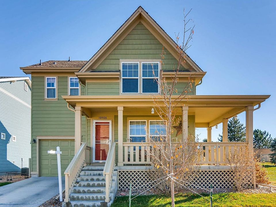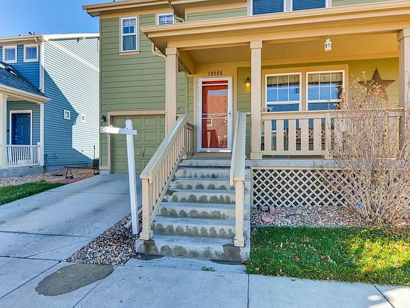 Wonderful 2 story home in Belle Creek across from park and adjacent open lot for privacy. Large Wrap around covered front porch for morning coffee. Enter open kitchen with maple cabinets and white appliances with eating space. Family room with dark/rich wood floors and tons of natural light. Rear yard has built in fire pit (up top) and gardening area. Large master with private full bath and 2 additional bedrooms with shared full bath. Basement with laundry room and rough finished bedroom for the teenager or visitor. Wonderful community with no HOA but provides maintained parks & grounds, free fitness membership & events. Charter school within neighborhood or public schools within 2 miles. Close access to freeways and shopping. Downtown Denver is 15 minutes away. Great opportunity at this price point. Come take a look!