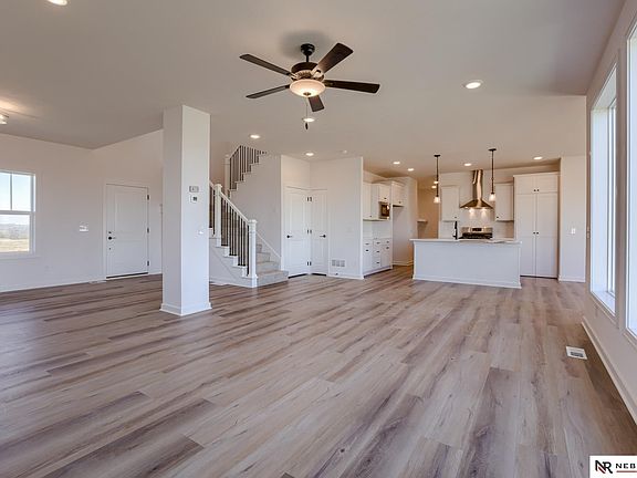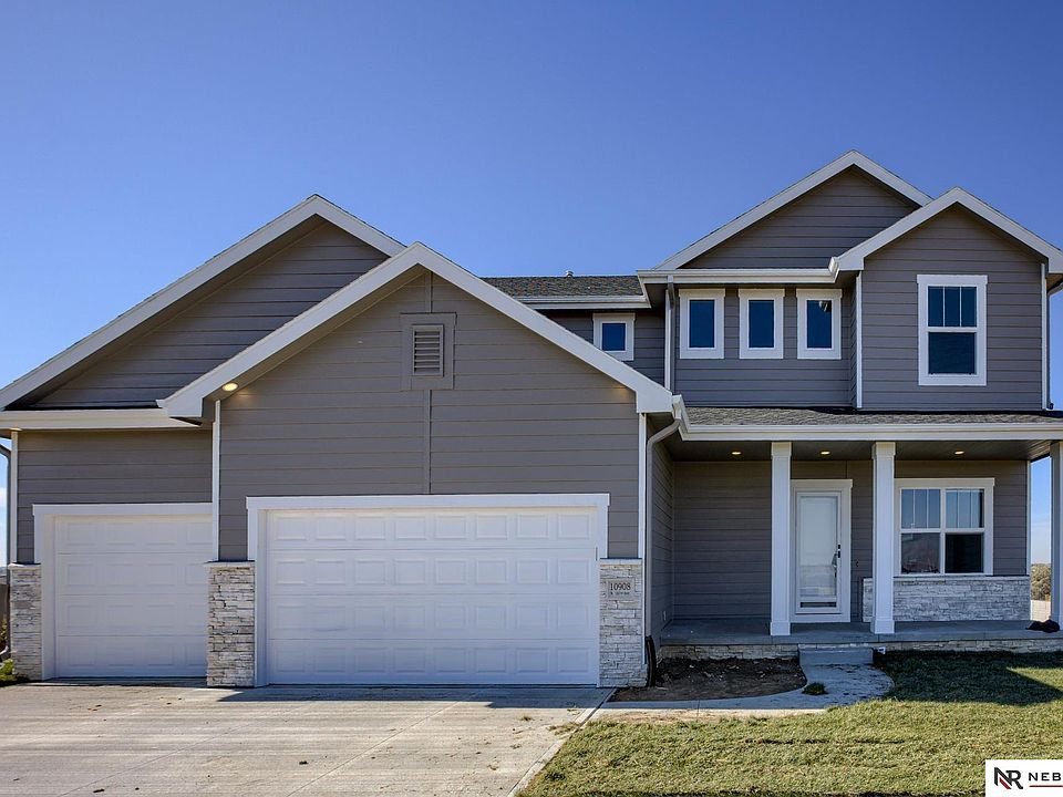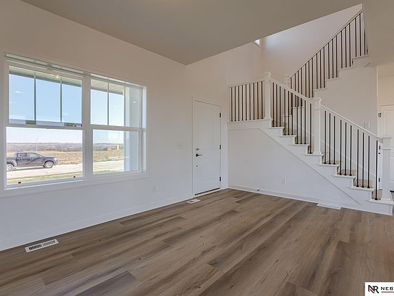 The Edison, a stunning home built by The Home Company, boasts a 5-bed/3-bath/3-car layout. Situated as a walkout home atop a hill, it features an inviting extended front porch that welcomes you with ample natural light and stunning panoramic views. The extended back deck, a substantial part of it covered, provides the perfect space for relaxation and gatherings of various sizes. This popular layout is highlighted by the thoughtful inclusion of a hood vent exhaust in the kitchen, a hidden pantry, and a main floor bedroom. Quartz countertops are seamlessly integrated throughout the home, emphasizing a modern and elegant aesthetic. The primary bedroom stands out with a sitting space, two separate walk-in closets, and a generously sized walk-in shower. This home is move-in ready with a builder warranty, offering convenience and comfort. (168th St north to Bennington Rd, turn right and head towards 161st St. The entrance for the neighborhood is directly off of Bennington rd.)