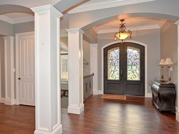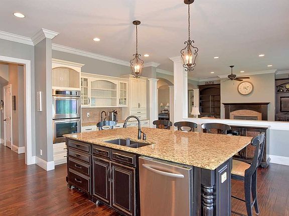 Welcome to this inviting one-and-a-half-story luxury home with a walkout lower level in picturesque Eagle Crossing in McCutchanville. Ideal for entertaining, and with plenty of living space for everyone, this quality built home has beautiful views and offers all the expected high-end finishes including an engineered hardwood floor, beautiful crown molding throughout, wrought iron stairway spindles, wood columns, custom woodwork, built-in shelves and cabinets, high ceilings, illuminated stairways, and brick and stone settings. Storage space is in abundance throughout the home thanks to generous closets, plus the central vacuum system is a major convenience. The kitchen and living room have been opened into a warm great room that features a gas log fireplace set in brick with a wood mantle and flanked by bookshelves. The gourmet kitchen has room for an entire family with a large dining area with a three-sided exterior view, plus a breakfast bar that is part of a large center island with granite counter; the kitchen is decked out in stainless steel KitchenAid appliances including a 6-burner gas range and double wall ovens and features a prep sink, a walk-in pantry with second refrigerator, and a built-in planning desk. The main level homeowner s suite provides a luxurious bath featuring separate vanities, a soaking tub, a ceramic-tile shower, and a huge walk-in closet. A second spacious bedroom suite is found on the main level, along with a half bath, laundry room with utility sink and a stackable washer and dryer combo, and a mudroom and utility closet with a sitting bench and shelves. The large bonus room has many possibilities, plus access to a large walk-in attic space that could be finished for additional living space. The walkout lower level is a whole other world with a large wet bar, a rec room with a wood-burning fireplace set in a stone surround with wood niches, three bedrooms with walk-in closets and two full baths (one with a dual vanity), an extra room with many potential uses, a cinderblock safe room, a large storage room, plus a lower-level garage bay with utility sink and overhead door. The lower level stays cool in the warm weather months due to its orientation to the sun, which is a boost to the energy bills. The oversized 3 car garage is complete with golf club cubbies, a built-in storage cabinet, and a utility sink. Enjoy the outdoors with the covered deck and railing that were both replaced in 2019 and just re-painted, and a covered pati