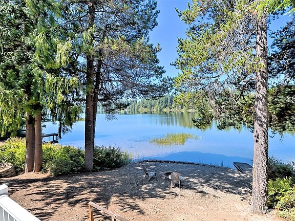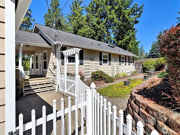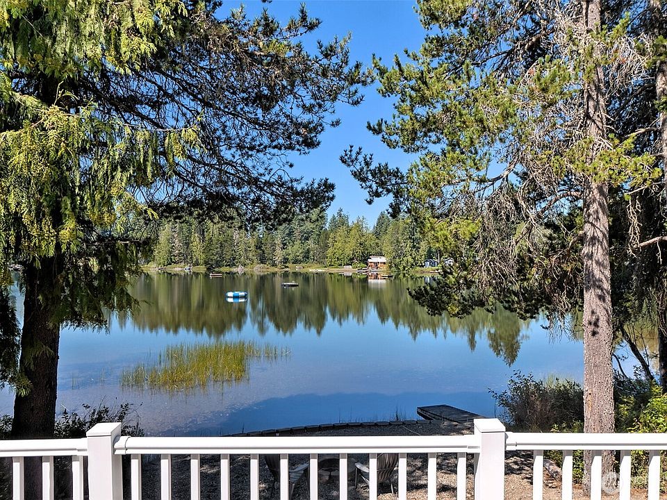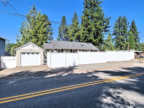 Tucked behind a white vinyl fence, open the gate to your peaceful lakefront home on Trails End Lake. Enjoy single-level living with sunlit rooms & easy-care vinyl flooring throughout main living area.The open kitchen features plentiful counters, cabinets, & an island all while keeping the lake views in sight. Split floorplan offers privacy between primary & guest bedroom.Front courtyard & low-maintenance landscaping create charm, while French doors lead to tranquil backyard living on a non-motorized lake. Voluntary HOA includes Hood Canal access. Bonus: extra-long garage for parking & storing waterfront toys.Every day is a vacation here whether it's fulltime, parttime or recreational living. Possibly an investment/vrbo opportunity as well.