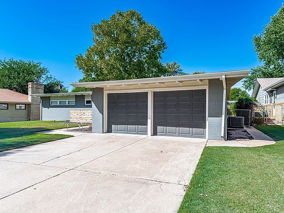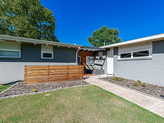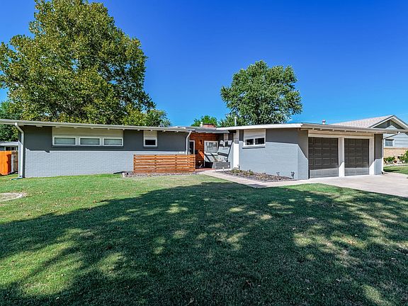 Look at this beauty! Nestled perfectly in a quiet neighborhood in the heart of East Wichita, this mid-century masterpiece, fully remodeled, 3-bedroom, 2-bathroom, all-brick home is ready to be called home. No detail was spared in this turn-key ready home featuring stunning engineered wood flooring, on-trend interior and exterior paint, plush bedroom carpeting, and bathroom and shower tile. Additionally, new systems and mechanics of the home, new as of 2019, include new HVAC, new kitchen appliances, new windows, new interior and exterior doors, new trim and baseboard, newly poured garage floor, new lighting, new cabinet hardware, new door knobs, beautiful new quartz countertops in kitchen and bathrooms. Step inside and the vaulted ceilings with wooden beams span the open living space featuring a focal wall built-in bar with geometric wallpaper and divided by a brick accent wall showcasing a wood-burning fireplace on each side creating two living spaces. Both open to the formal dining and gorgeous kitchen with an expansive amount of cabinetry and countertop space featuring a large eating bar, a matching stainless steel range and vent hood, floating shelves, and on-trend tile backsplash. A separate laundry room with a drop zone with hooks, cubbies, and folding space is conveniently located behind the kitchen. A large primary ensuite and two additional large bedrooms also feature vaulted ceilings with wooden beams. An updated full hall bath completes this 2,100 square foot on-grade home. Both the primary ensuite bathroom and the hall bathroom were upgraded with custom-built floating vanities, beautiful quartz countertops, plumbing fixtures, floor tile, and shower tile. A slider takes you out back to the fully fenced backyard with large shade trees and a patio with party lights. A great home for enjoying family time and entertaining with friends! Don’t miss it!