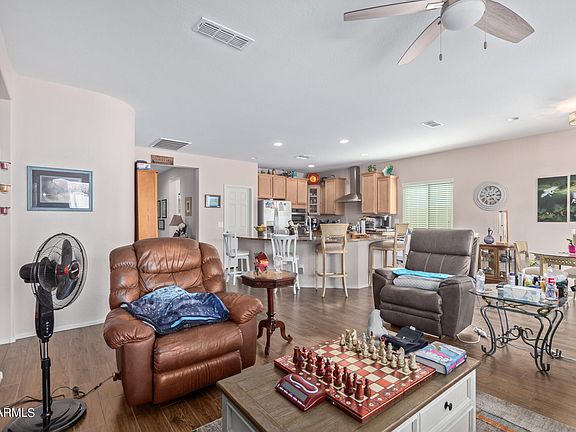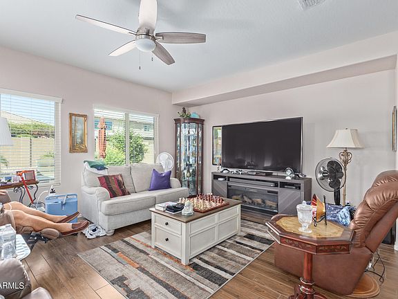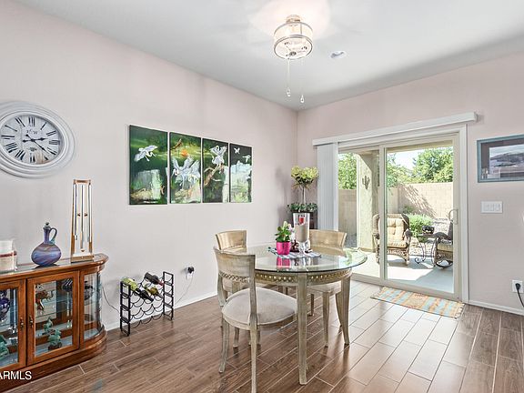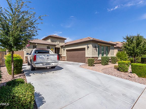 Discover a space where modern sophistication meets timeless charm! Located in the peaceful Bella Via, this beautiful home offers 3 beds, 2 baths, a side 2.5-car garage, and a well-manicured landscape. Enter to find a desirable open layout paired with neutral paint, abundant natural light, and porcelain wood-look tile flooring in common areas. The impeccable kitchen boasts granite counters, a pantry, recessed lighting, staggered cabinetry w/crown molding, and a curved island w/breakfast bar. Plush carpet adds comfort to the bedrooms! Main bedroom has an ensuite with dual sinks, tiled step-in shower, and a walk-in closet. Moving outdoors, the large backyard awaits! With a covered patio, well-laid pavers, and artificial turf, it is the perfect spot for relaxing or entertaining. Welcome home!