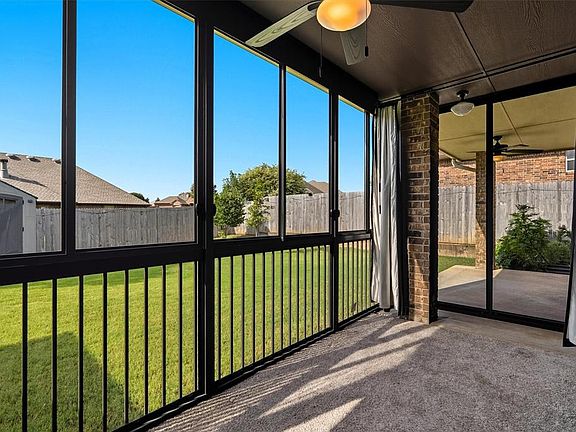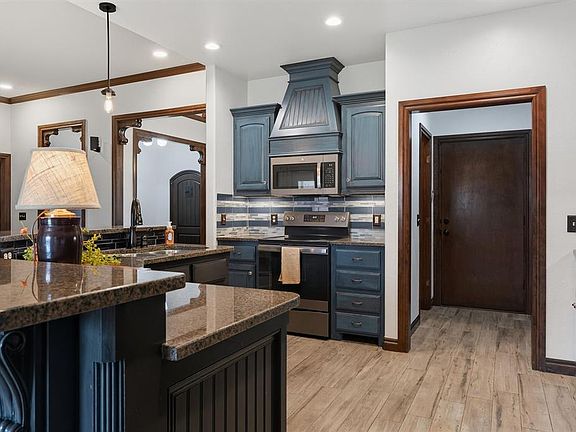 Looking for a home in Choctaw school district that shows beautiful craftsmanship? Then you have found your home. As you walk up to the front door you will notice a brick arch to a covered porch and an arched front door. The entryway and dining area are good sized and have beautiful wood like tile that defines those two spaces. The gas fireplace has a beautiful wood mantle and surround that is built up and has a tile inset. The large living area opens into the kitchen with a curved bar area with granite. The kitchen is stunning with its blue cabinets, updated tile backsplash & granite counter tops. The refrigerator stays and it is stainless steel. The sellers ordered a special magnetic cover that is on it but it can be removed. Large walk in pantry just behind the stove in the hallway across from the laundry room. The 2 bedrooms are nice size with double door closets. The hall bathroom has tile shower/tub combo and the bathroom has plenty of storage with extra cabinets. This plan is a mother-in law pan (primary suite is separate) the primary suite is oversized and cozy feel, the bathroom has a large walk-in tile shower plenty of cabinets and double sinks, this brings us to the wonderful & spacious walk-in closet, with hanging space and shelves everywhere. The back covered patio is perfect for watching the games (tv mount stays) or hanging out with friends. In 2023 the sellers had half of it screened in and it is an extended living space on cool nights. The shed stays in the backyard and is like new. Worry free with the roof just 2 years old. Close to Tinker and Choctaw located in the wonderful Windmill Farms neighborhood.