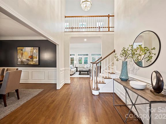 Stately Low Country home in Ballantyne Country Club boasts a "Southern Living" front porch & back veranda, perfect for outdoor living! The interior features a Dining Room w/beautiful millwork, kitchen w/white cabinetry & quartz countertops, subway tile backsplash, SSTL appliances, & updated lighting. Brkfst area & Grand 2-story Great Room w/Fireplace & custom built-ins. Beautiful hardwoods, vaulted ceilings, french doors, plantation shutters, front & back stairs & skylights flood the home w/natural light. Primary on main w/large bath & HUGE custom closet. Laundry convenient to backload garage entry w/Drop Zone. 2nd FL:3 bdrms w/walk-in closets, two white tiled baths. WOW-office OR 5th bedroom w/built-in workspace AND huge BONUS! Large PRIVATE yard, seasonal colorful landscaping-classic design! Ideal for those who appreciate comfort & style. New bdrm carpets, refinished hdwd floors, freshly painted. Stunning presentation-this home is designed for family time and engaging entertainment!