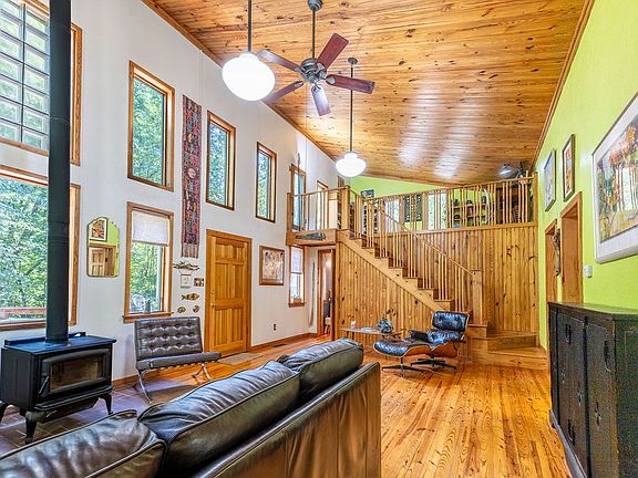 Santa Fe–Style Retreat on 2.81 Acres! This unique property blends Southwestern charm with modern, eco-friendly living. Inside, 17-ft ceilings, pine accents, real wood floors, and passive solar design for exceptional energy efficiency. A versatile loft serves as a 3rd bedroom, office, or gym.