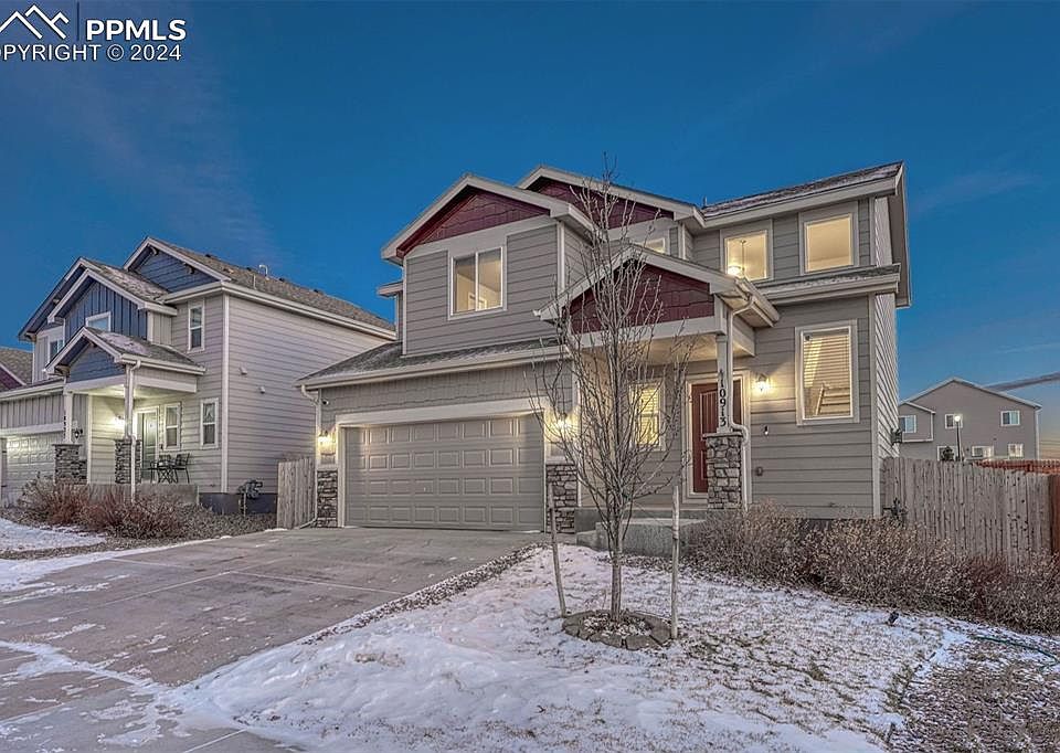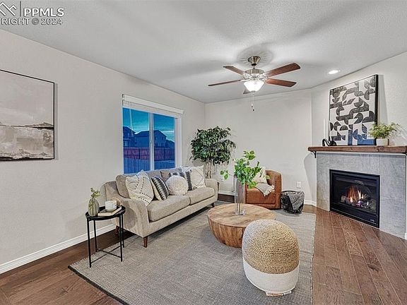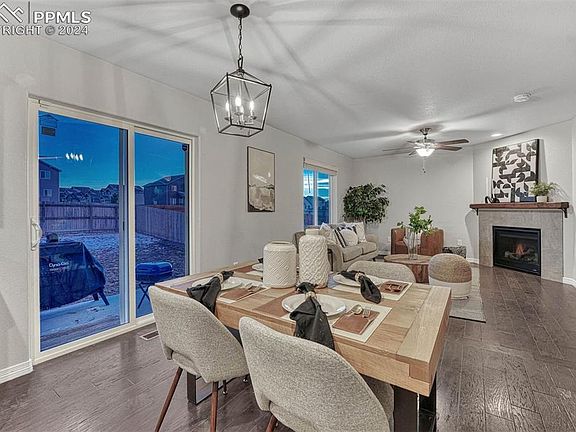 Don't miss this stunning single family home nestled in Lorson Ranch in SE COS. Boasting 3 spacious bedrooms & 3 baths, this home offers ample space for comfortable living. Welcome guests at the covered front porch & greet them in the large entry foyer. Main level features beautiful wood floors & an open floor plan seamlessly connecting the living, kitchen, & dining areas, making it perfect for entertaining & effortless everyday living. Chef's dream kitchen w/ granite countertops, subway tile backsplash, pantry, decorative shelving, recessed lighting, & ample workspace for meal preparation. Stainless steel appliances add a touch of sophistication, while the gas fireplace in the living room creates a cozy ambiance during colder months. Upstairs, you'll discover a primary bedroom w/ walk-in closet & adjoining 4-piece bath w/ tall granite top vanity. The mountain views from the front porch and backyard are simply breathtaking, allowing you to soak in the beauty of Pikes Peak. A large backyard is a true oasis, complete with a fire pit, where you can gather with friends and family for memorable evenings. Additionally, the property features a sprinkler system, ensuring effortless maintenance of the lush greenery. Conveniently located near walking trails, this home offers easy access to outdoor activities, perfect for the nature enthusiast. The attached, insulated, and finished garage adds to the appeal, providing space for your vehicles and storage needs. Perfectly located for Fort Carson and Schriever AF Base.