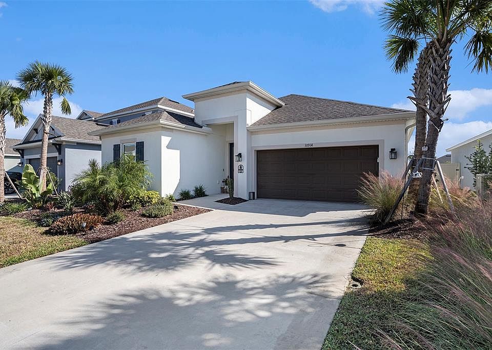 Welcome to 10914 Fieldstone Dr — a beautifully upgraded Taylor Morrison Antigua model home filled with natural light and designed for modern living. Step inside to an open floor plan enhanced by 10-foot ceilings, upgraded tile flooring, and elegant fixtures that create a bright, airy, and sophisticated atmosphere throughout. The heart of the home is the open-concept Chef's kitchen, featuring stainless steel appliances, quartz countertops, a gas cooktop, and plenty of space for cooking, gathering, and entertaining. In addition to that, the kitchen features an oversized butler's pantry. The seamless flow from kitchen to living and dining areas makes everyday living effortless. All bedrooms are generously sized with expansive closet space, offering comfort and practicality. The large primary suite includes a spa-like ensuite bathroom with modern finishes and ample storage. Enjoy peaceful mornings and relaxing evenings on the spacious screened-in lanai featuring pocket sliders and overlooking a serene pond—your own private outdoor retreat. Additional upgrades include a tankless water heater, water softener, and newly installed gutters, and built-in garage storage racks providing efficiency and long-term value. Located in a quiet, well-maintained neighborhood just minutes from shopping, dining, and entertainment, this home perfectly blends comfort, convenience, and style. Property is also has easy access to I-75 and is in close proximity St.pete, Tampa, and Sarasota. The home is also close to the new construction of the long awaited Parrish hospital. Don’t miss your chance to make this stunning property yours. Schedule your showing today!