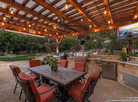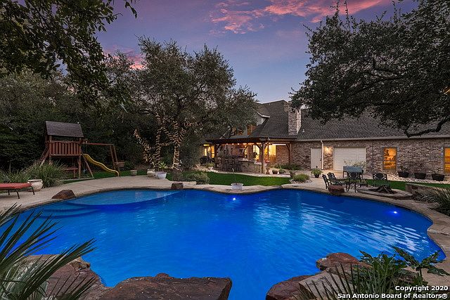 Hill Country living at its finest on this extraordinary wooded lot in the prestigious Hunters Ridge Estates. This premier home in the Helotes area is surrounded by plenty of mature oak trees and pristine landscaping, creating great curb appeal. The grand entry welcomes you with high tray ceilings and opens to an exquisite formal dining room with crown molding, wall accents and custom built-in china cabinets. Separate lounge area boasts a floor to ceiling stone accent wall and numerous large windows overlooking the backyard oasis. You will love the beautifully appointed island kitchen with updated goose neck faucet, farmhouse sink, pendant light fixtures, stone walled breakfast bar, updated cabinetry, built-in oven and microwave, separate coffee station, granite counter tops and built-in grill cook top. Relax in the luxurious main suite featuring high tray ceilings, designer windows, recessed lighting, and French doors that open to the back patio. Escape to the main bath that includes His & Hers vanities, antiqued bronzed faucets, accent tiled shower and separate garden tub. Walk outside to your backyard oasis that offers a complete outdoor kitchen + covered patio that over looks the heated in ground pool! Follow the beautiful flagstone to a separate seating area with a built-in stone fire pit. Extras include a separate hot tub and loads of storage in the 3 car side entry garage. Conveniently located minutes away from popular Northside Schools, shops at Old Town Helotes, and breathtaking Hill Country views! Don't wait long as this great home is ready for your family to occupy today! Call us for more information!