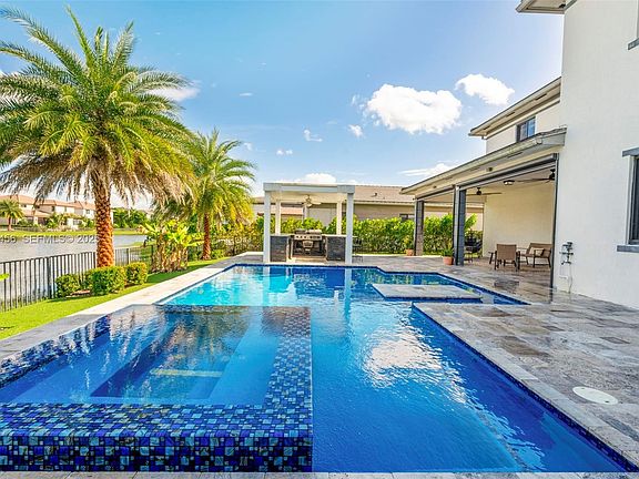 Experience elevated living in this rare Silver Stone model private pool and waterfront, perfectly nestled on one of Cascata’s most exclusive manned gated community. This expansive 5-bed, 5.5-bath residence offers exceptional versatility with a true Next Gen in-law suite, complete with a private entrance, features a kitchenette, living area, 1 bed, 1 bath, and its own separate private laundry stackable washer and dryer—ideal for extended family or guests. Step inside to an open-concept layout highlighted by a chef’s kitchen with premium stainless steel appliances, oversized island, and seamless flow into the main living space. Smart home upgrades features security system and cameras, and electric shades add modern convenience throughout. The ground-floor primary suite features a spa-inspired bathroom with double vanities, separate his and hers custom design built-in walk-in closets, and serene views of the backyard. This home is fully equipped with impact windows, a spacious 2-car garage with extra large driveway, and high-end finishes at every turn. Step outside to your private resort-style oasis—where everyday living feels like a getaway. The Dream Backyard with over three hundred thousand in upgrades showcases, a heated pool, spa, tranquil waterfall feature, and an impressive custom summer kitchen complete with grill, griddle, refrigerator,dual burners, sink, storage, pergola, and remote-controlled screens. This home is an intimate relaxation and unforgettable entertaining.