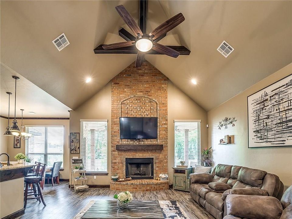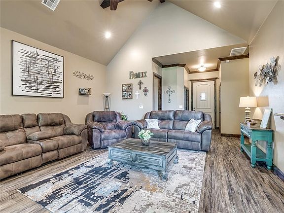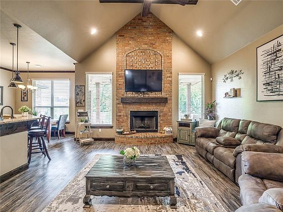Stunning, well-maintained home with 15' Vaulted Ceiling with Stained Beams and Gas Fireplace. Home boasts Stained Knotty Alder Kitchen Cabinets and Stained Wood Work in main areas as well as 10' Ceilings. One Owner, 3Bed/2Bath/3Car-Garage with a Study. Spacious Master Bedroom has ample natural light, and the Master Bath has a Whirlpool Tub and separate Walk-In Shower. Home has the Security System with monitoring service. Enjoy the Gas Fireplace on the back patio and your own oasis in the yard that backs to a nice Green Belt for quite living. Windmill Farms is a great area of East Midwest City with schools located in Nicoma Park/Choctaw School District. This home will not last. Call for a showing today!