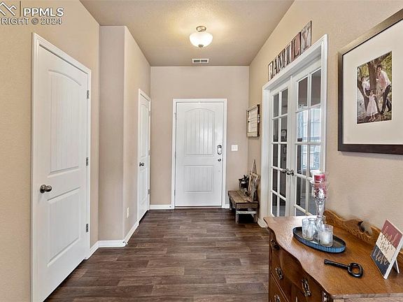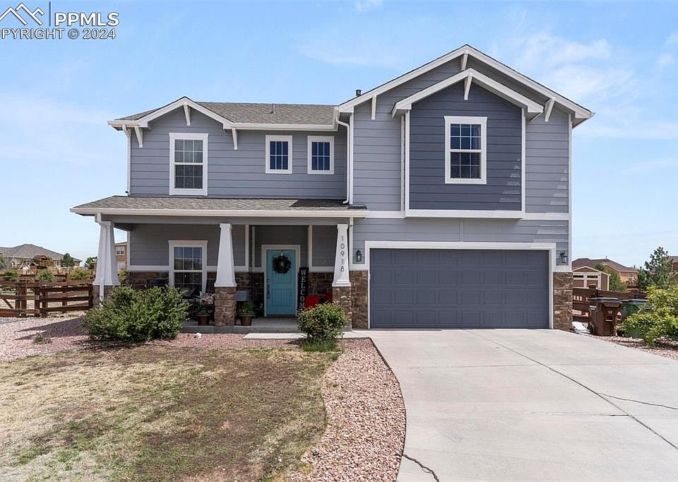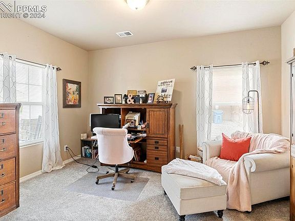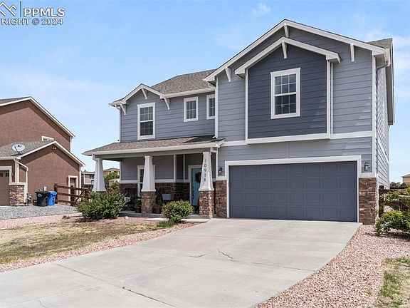 HIGH DEMAND FLOOR PLAN - THE CHARLESTON by Challenger Homes doesn't come on the market very often - DON'T MISS THIS 4 BR, 3 BA, 3 car garage (tandem) home inclusive of office with French Doors, and loft. Open floorplan with an abundance of windows allowing for plenty of natural light throughout. Entryway with nook for your favorite furniture piece. The gourmet kitchen features granite counters, tall maple cabinets, walk-in pantry and SS appliances. The convenient walk-out door from the kitchen/dining room makes outdoor entertaining a breeze. The spacious loft awaits your imagination...a media room, a library, study room, toy room, family room or? A spacious primary suite provides serenity with sitting area, walk-in closet and 5-piece bath. Three additional bedrooms with a shared bath and a double vanity complete the upstairs. Car enthusiasts and hobbyists will love the 3 car garage (tandem - giving you an amazing storage area) with plenty of room for RV parking as well. New Furnace in 2020, new exterior paint and carpet 2021. The almost 1/4 acre fenced lot is perfect for pets and/or children to play safely while you sit back and enjoy the views from the covered front and back porches. Great location with easy access to Peterson and Schriever Air Force Bases. NO HOA, but the neighborhood is well-kept. Great sneak views of Pikes Peak and throughout the neighborhood. Brand new furnace 2020